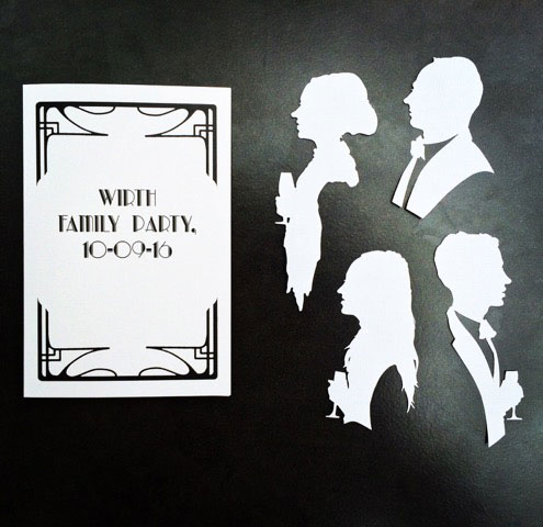 As added extras, you may have your cards custom printed with your company name and logo, or the date and venue of your wedding – whatever you’d like really! Cards come in standard sizes: 6” x 4” or 7”x 5” which means they can quickly be popped into a photo frame – which we can also supply. He can also offer pre-cut silhouettes of key people at your event and an A3 size montage of all the silhouettes that were cut at your event.