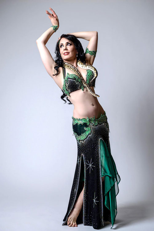 Boasting performances that are both traditional and contemporary, this exceptional bellydancer can perform with traditional props such as veils, zills, canes, sword, fans, and wings. In addition to her traditional performances our bellydancer can incorporate contemporary props such as; LED light-up wings, light-up cane and glowing costumes as well as performing thrilling routines with candelabra, candle-tray, balancing on a drum and of course, dancing with live snakes.