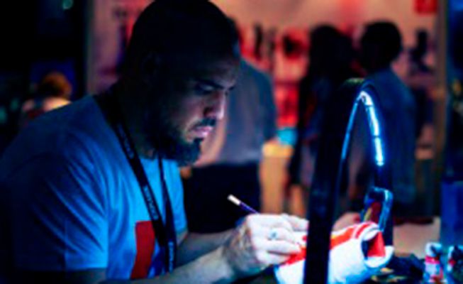 Offers unforgettable event art experiences, painting live and engaging guests with creative energy while customising trainers and accessories