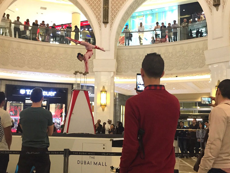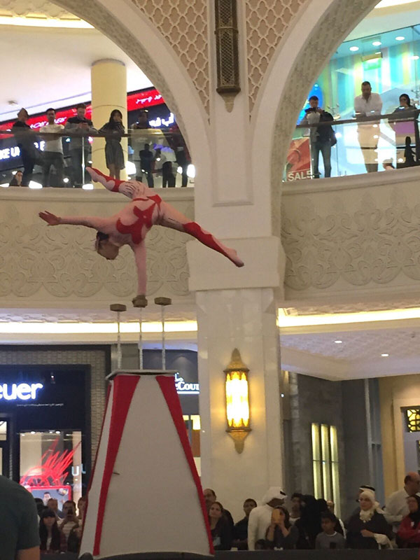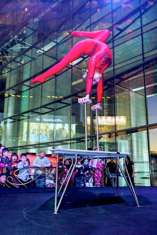 Our Mongolian hand balancer performed for audiences of all ages and different nationalities at the Dubai Shopping Festival, where she was a true sensation. She not only impressed spectators with her hand balancing act and contortion moves, but also by defying gravity performing her routine on a high pedestal.