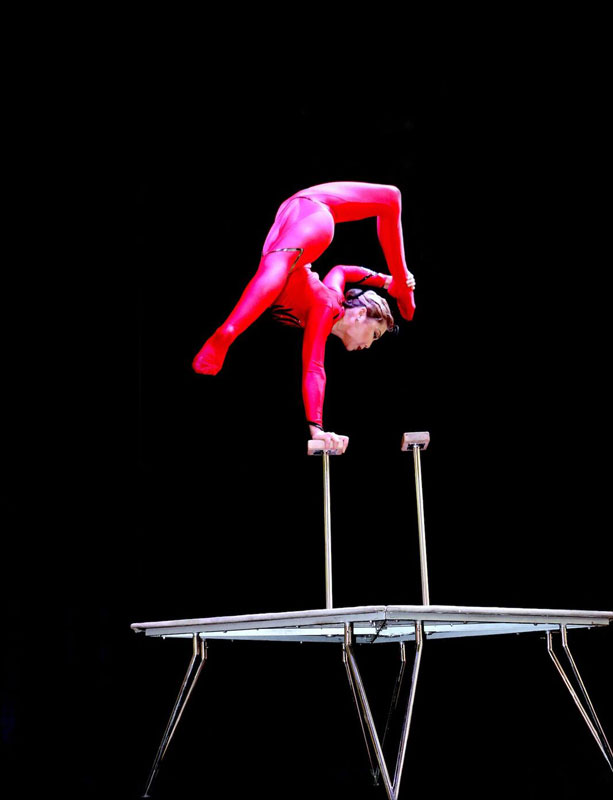 On top of that, this highly skilled circus performer can shoot an arrow with her feet while holding her entire body in the roof of her mouth, a trick that few hand balancers achieve so precisely. Happy to perform along with other artists, our hand balancing solo performer’s act can be adapted to bigger theatre productions or variety shows and to different performance spaces.