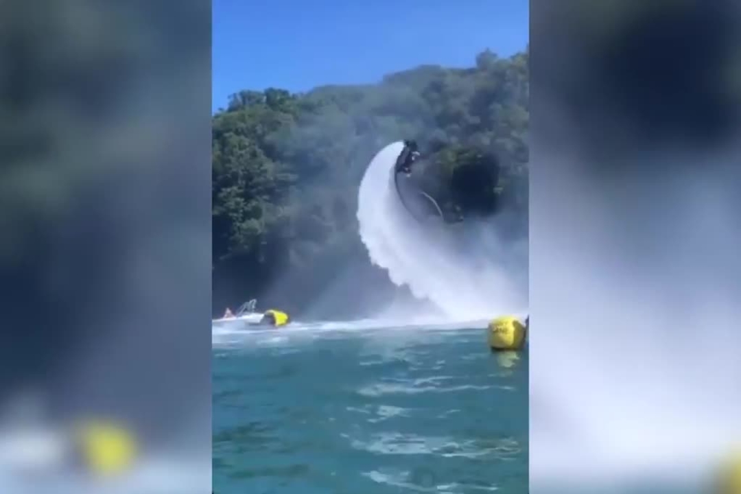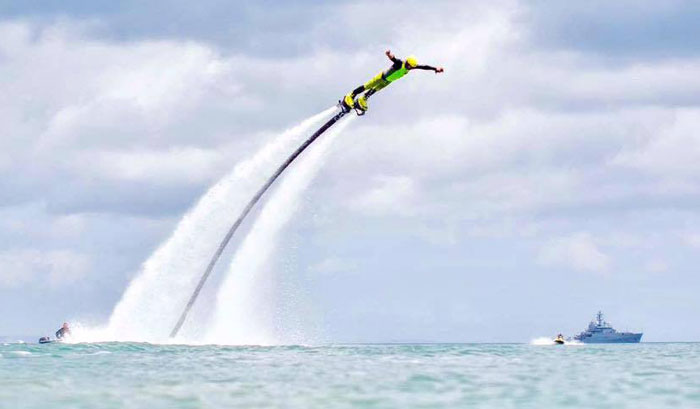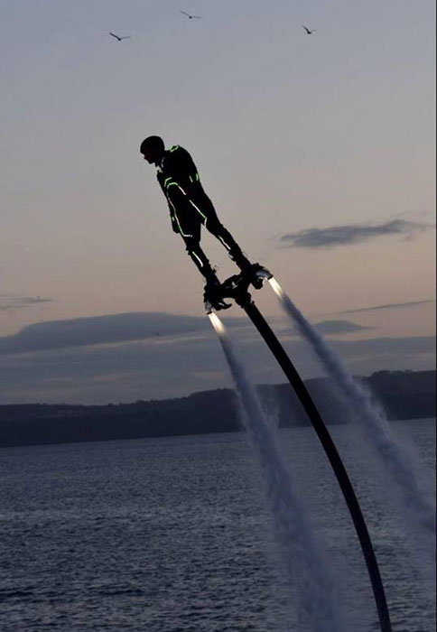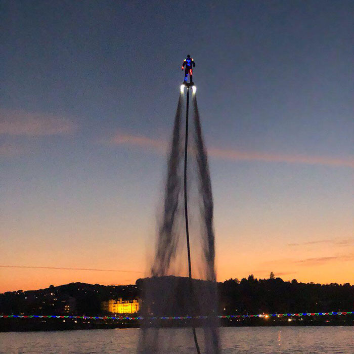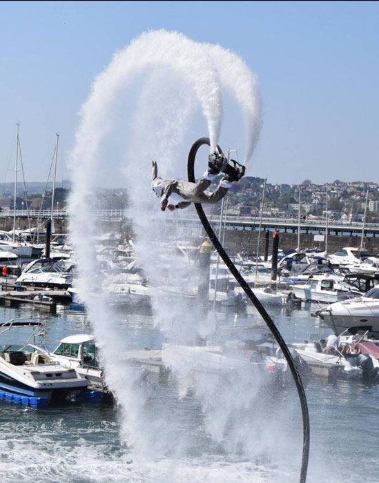 Devon-based flyboard specialist performs exciting shows executing flips, backflips and dolphin dives with a water jetpack attached to his feet
