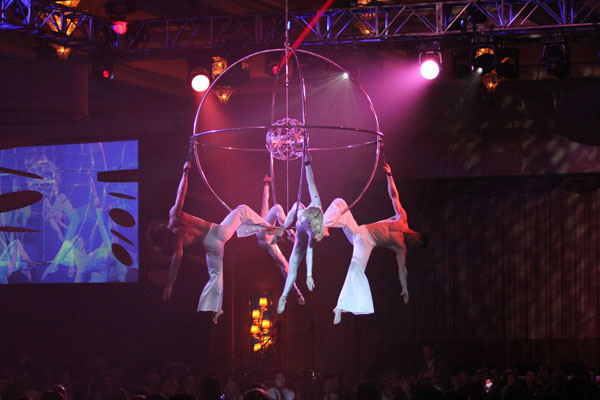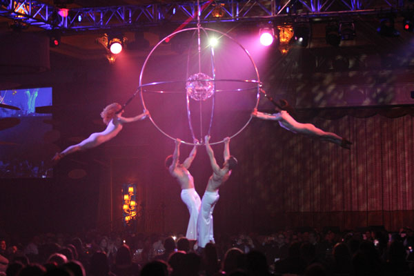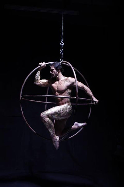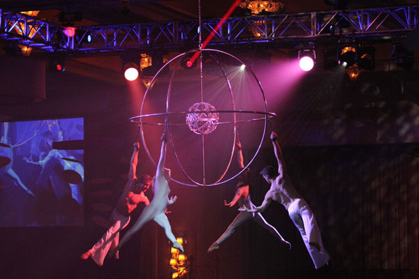 Performing on a custom made rig that has been engineered to look like a sphere within a sphere, these aerial dancers put on an extraordinary aerial performance showcasing elegant balances, and impressive feats of strength.