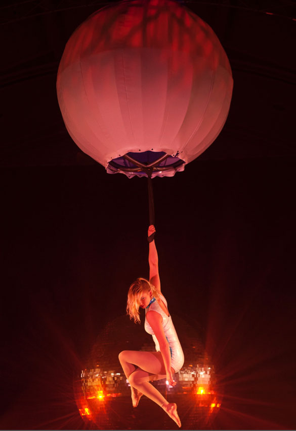 Two highly trained aerial acrobats perform an inspiring array of highly skilled aerial ballet manoeuvres on the spherical trapeze. Their elegant movements display precision, beauty and great strength.