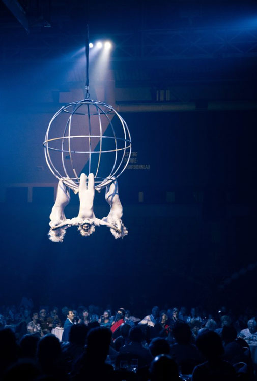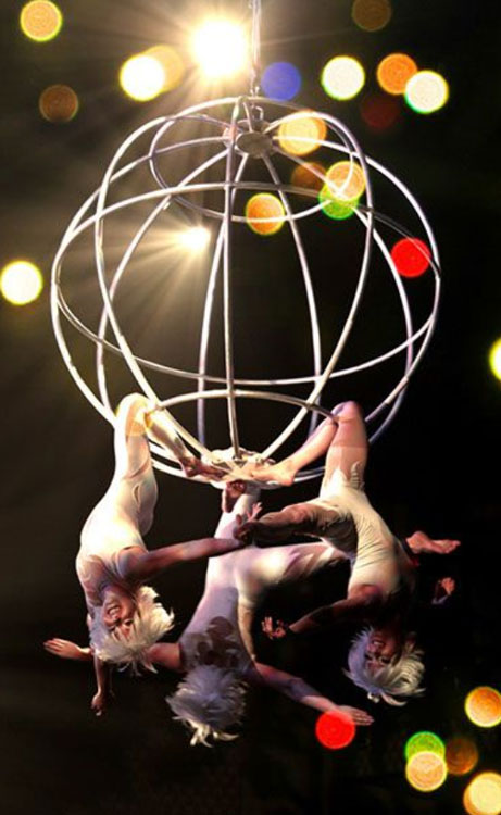 Available as solo sphere aerialists our triplet line up is a popular choice and is fabulous to watch as our Montreal aerialists interact with one another creating dynamic routines in the air that guests just can’t help but watch.