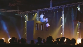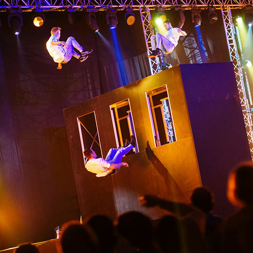 An incredible acrobatic display that sees performers performing a range of flips and tricks on two trampolines