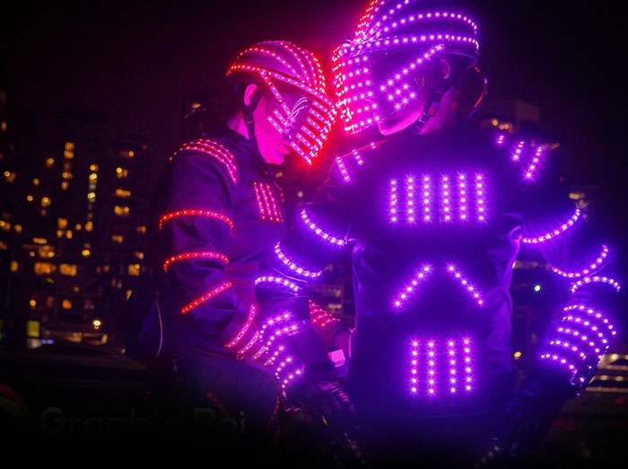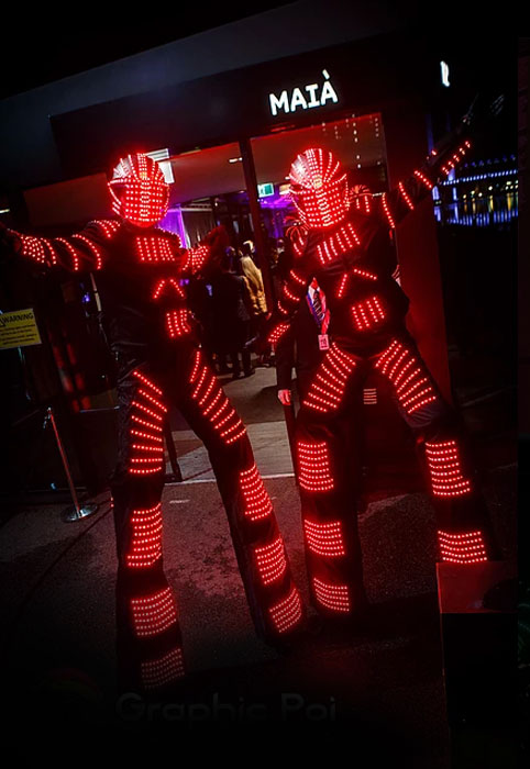 Our Sydney LED Robots on Stilts are the perfect roving act to capture people’s attention. They are so very tall and their costumes are so very bright that they capture people’s attention wherever they go. The walkabout LED robots are really well suited to any event with darkness or outdoor events at night. This makes their thousands of LED lights shine even brighter.
