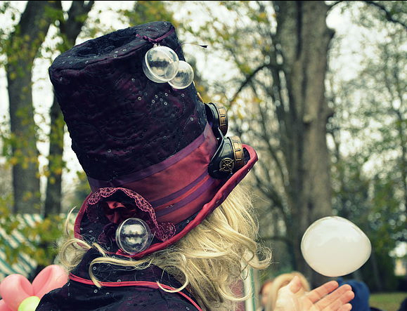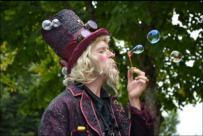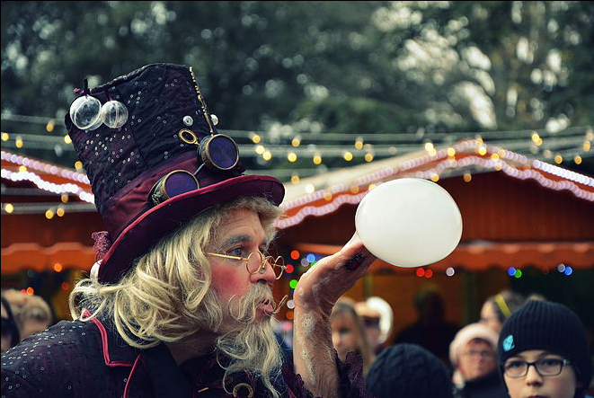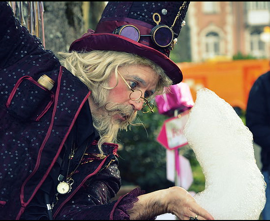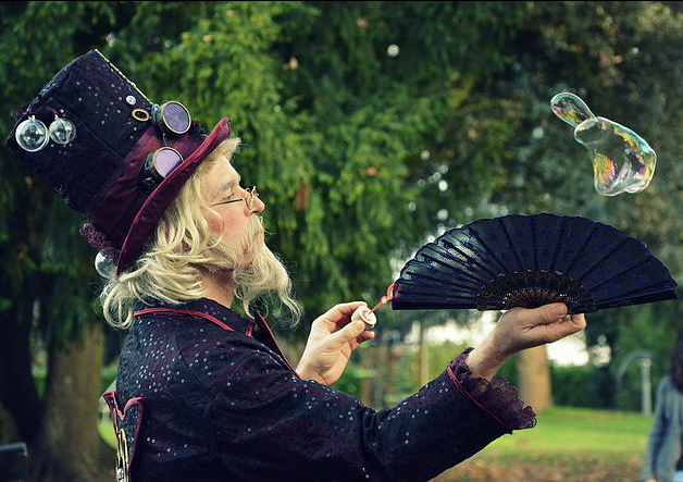 Dressed in an extravagant manner, this Themed Bubble Magician’s outfit is one of the things that strikes audiences most and that makes his performance unique and different. His big purple hat, steampunk goggles and long white hair and beard recalls the looks of an old wizard or a 19th century entertainer.
