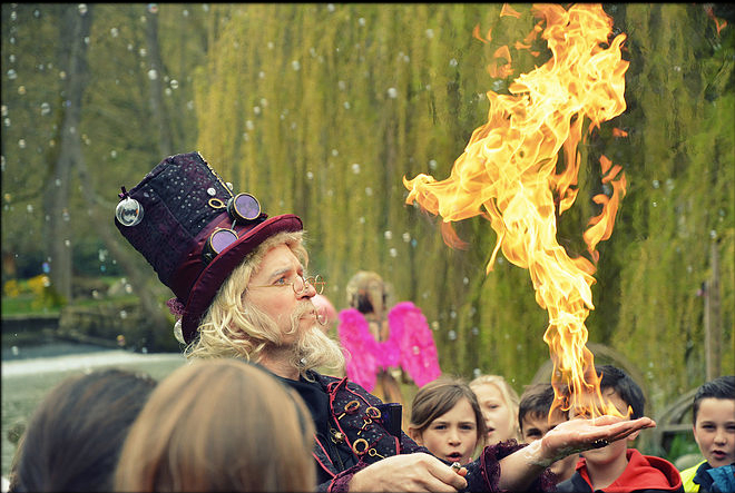 This versatile bubbleologist can carry out numerous and mind-blowing bubble tricks. He can blow a bubble inside a bubble inside a bubble, create bubble glasses, place objects inside bubbles and produce millions of bubbles children can follow and play with by using his fan or his bubble wand. Our talented bubble performer can even do tricks involving fire that will blow audiences away and leave them wide-eyed.