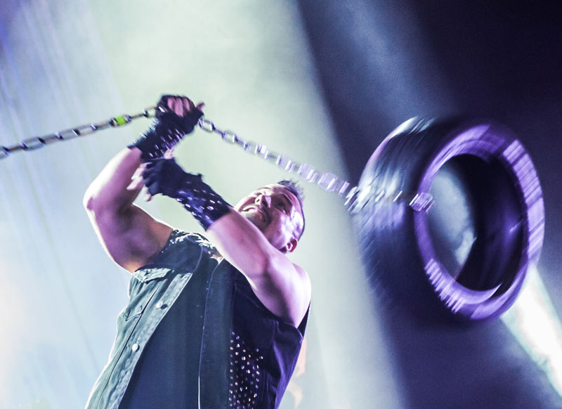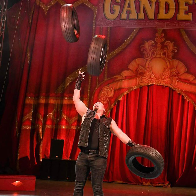 This entertainer juggles a number of tyres in his impressive show, that highlights his strength and ability