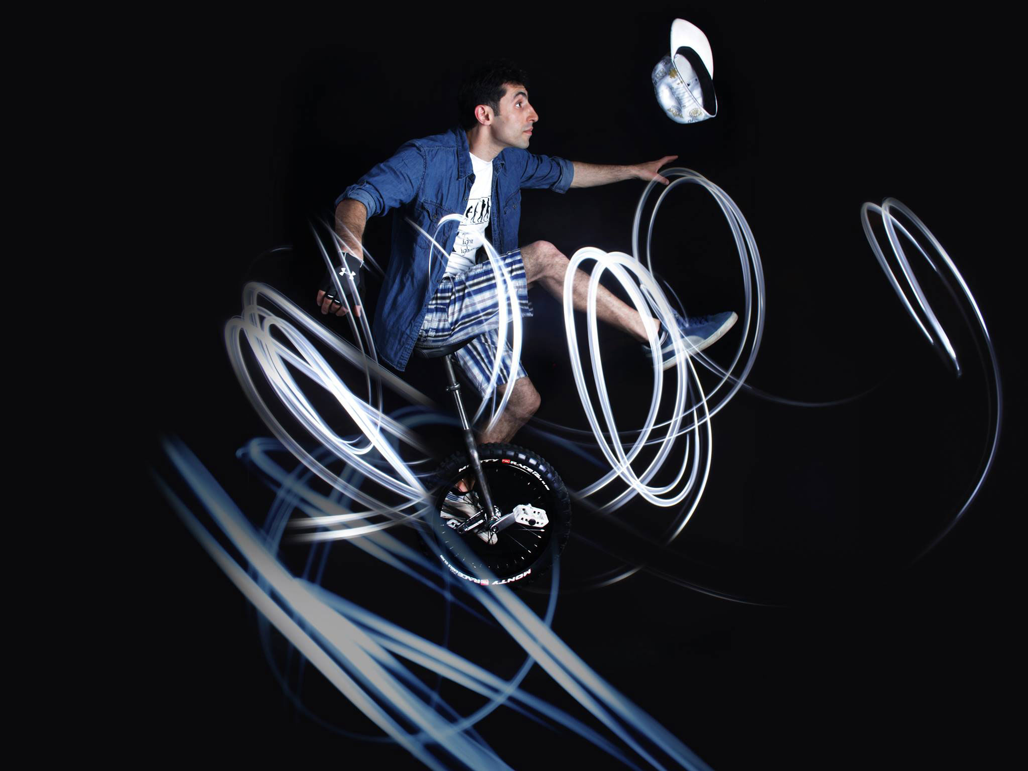 This trick artist performs street unicycling, jump rope tricks and juggling finishing his act on a unicycle that has a wheel of 82mm in diameter