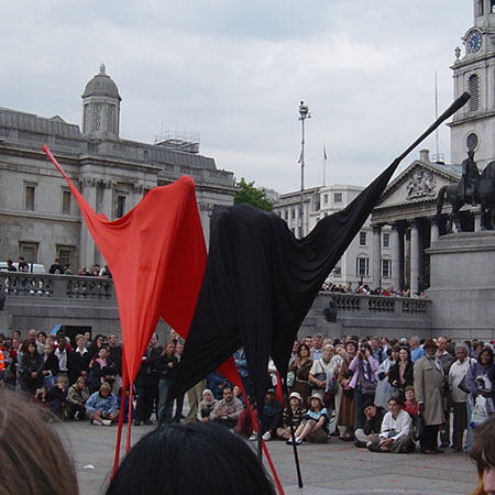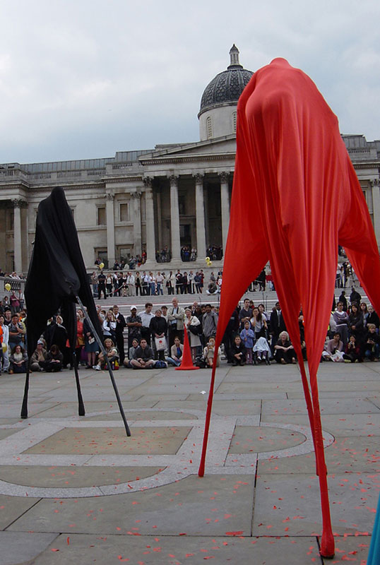 Our walkabout stilt walkers have performed at some of the worlds top venues and offer a dreamlike quality to their performance that is adored by both adults and children. Such places include The Kennedy Arts Centre in Washington, The Sao Paulo Arts Centre in Sao Paulo Brazil and the National Gallery London UK. The anonymity of this act engages its audience members by creating curious structures and interesting movements.