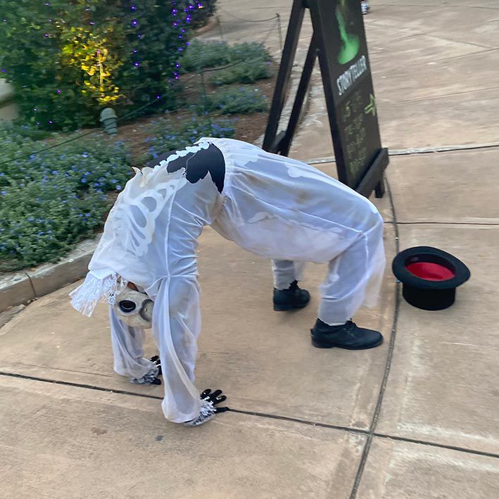 Our spooky skeleton loves to interact with guests of all ages, showing off her dance moves and contorting into impossibly impressive shapes