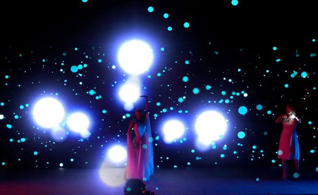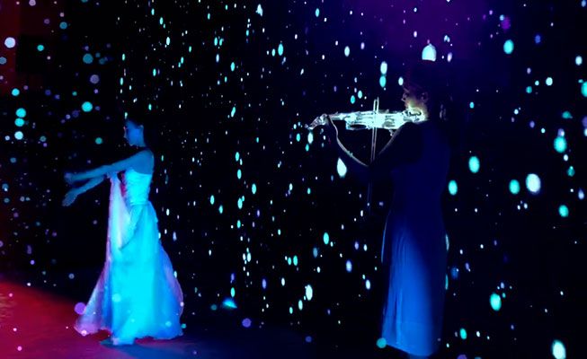 This dynamic stage show can also include live music for a solo musician with a crystal violin with LEDs that add to the futuristic atmosphere.
