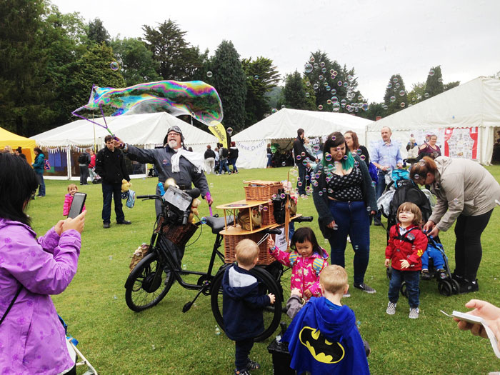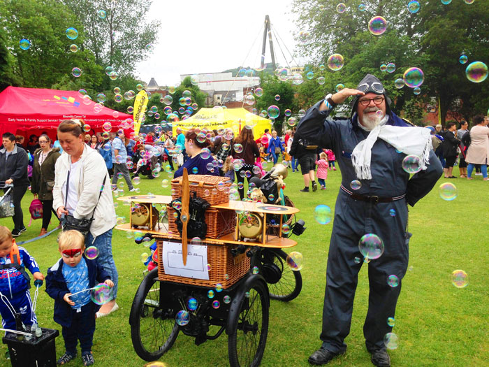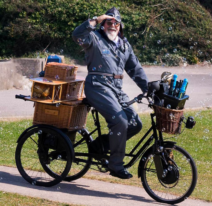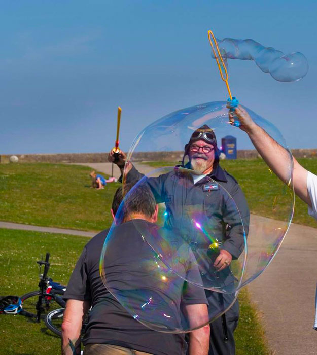 The high-flying vintage pilot glides in on his tricycle plane, whilst pumping out music, and disembarks his craft to deliver an attention grabbing bubble extravaganza before hoping back on to ride to the next group of guests. He encourages participants to assist him in making the biggest bubbles possible.