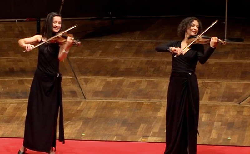 Captivating performance played as a duel delivered by two sophisticated virtuoso violinists