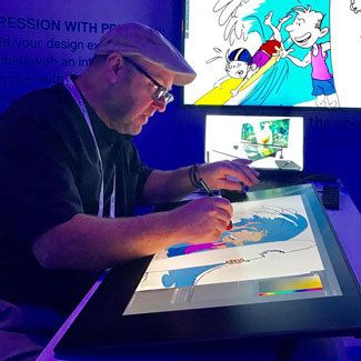 This award-winning artist is a former Scooby-Doo animator who has created stunning murals and signage for the London Olympics and Sydney Light Rail Network. A talented caricaturist, he can draw live at your venue without actually being there. Visitors can see him draw live on-screen and guests can collect their drawings straight from the printer at the venue. Perfect for those working to a tight budget as there are no travel costs involved, what's more, our artist can produce more caricatures as he gets to spend more time drawing and not getting to the venue.