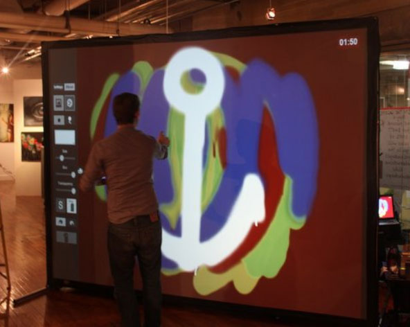The Virtual Photo Wall is an 8' X 10' Interactive photo booth that adds a WOW factor to your events.  Party guests step in front of the massive screen where they have their photo taken and before they can step away from the screen a life size image appears.  The reaction as they turn around to see themselves and their friends is priceless.  Next, they are handed the digital spray cans and in just a few seconds they are using their creativity and the broad pallet of colours to spray paint their names, funny lines, or using the digital stamps and stencils to create works of art.   After some fun and laughter they can save the image, share it on facebook, email it, and have a printed copy in lab quality prints for everyone in the group in just seconds.  Now that's cool!
