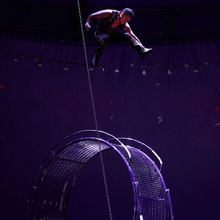 Watch our incredible artist perform death-defying stunts as he flips, spins and jumps in a wheel swinging like a pendulum