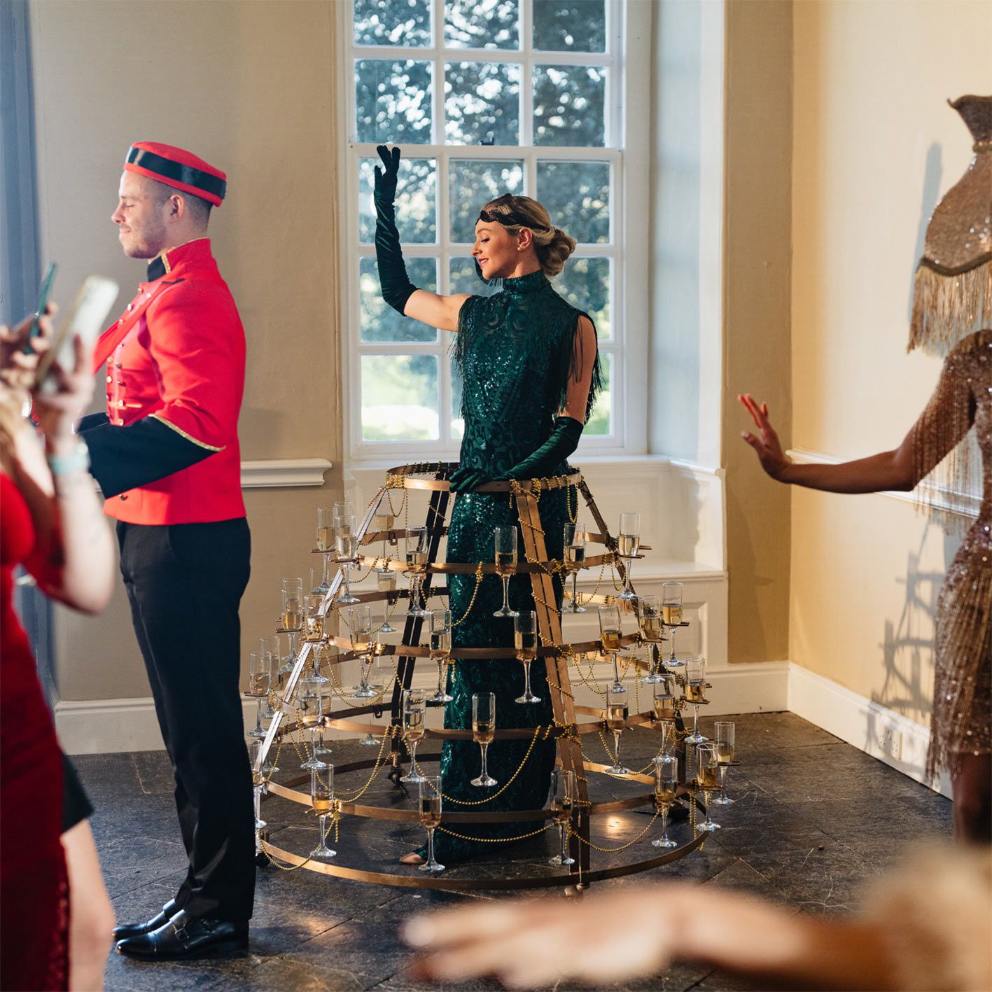 Welcome your guests to your next event with a flute of champagne served from an exquisitely handcrafted 1920s-themed champagne dress.