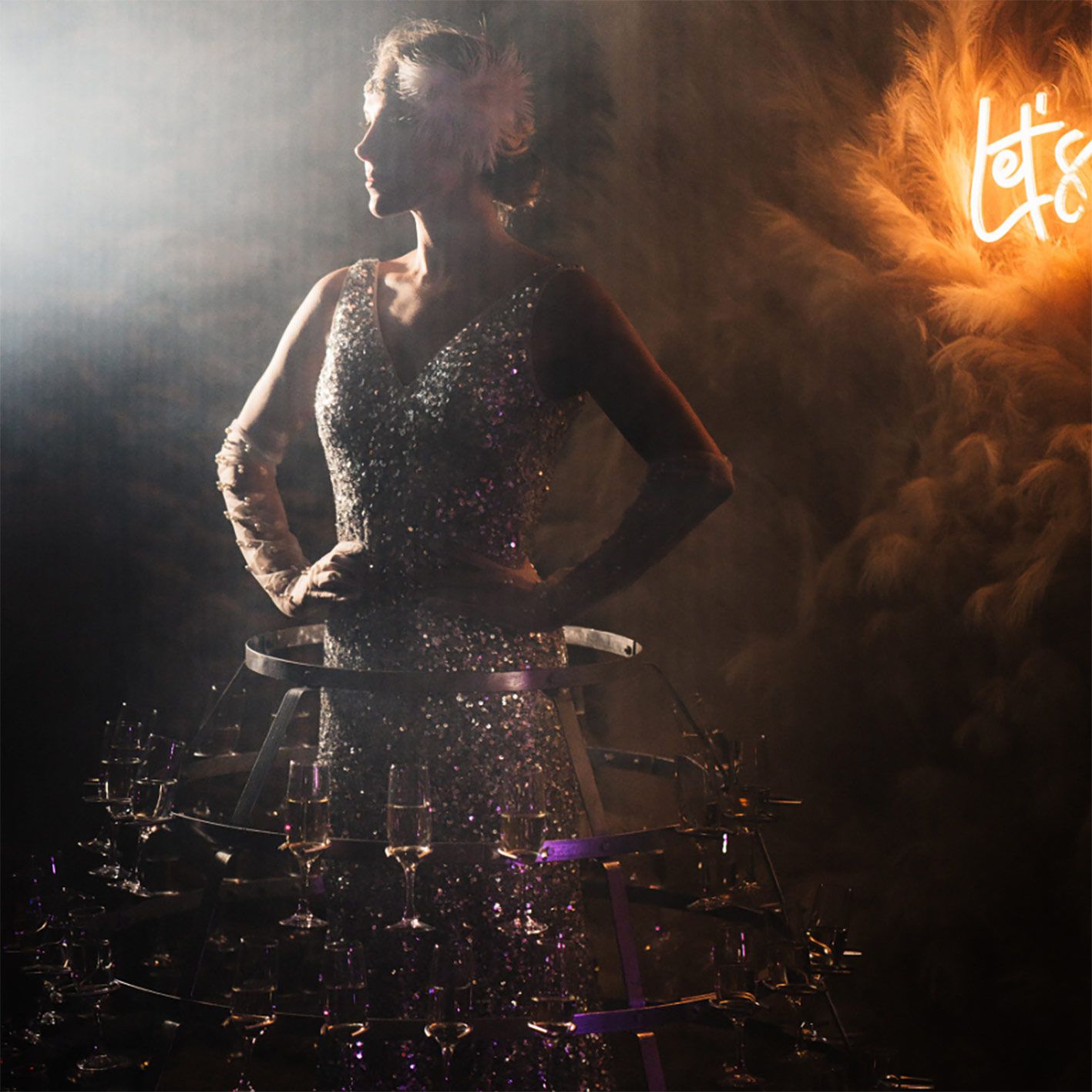 Our performer will welcome your guests with champagne, offering an interactive experience in the style of the 1920s. Ideal for a 1920s or Gatsby-themed event.