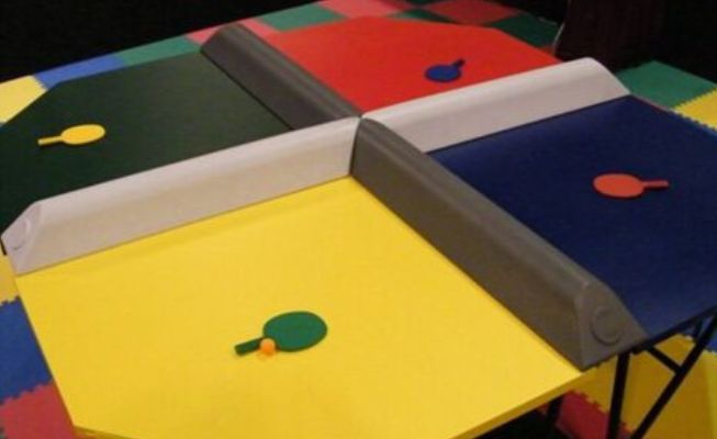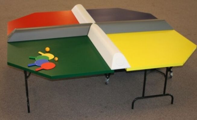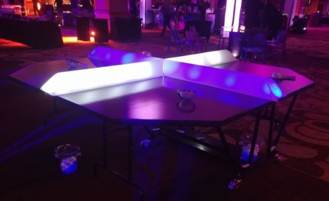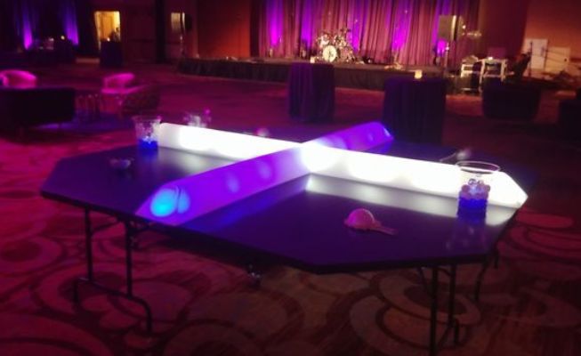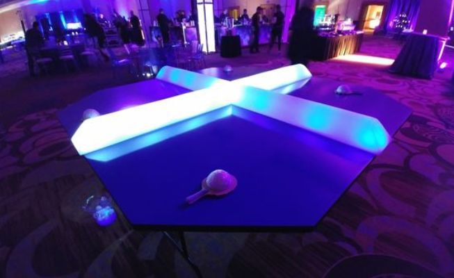 Unique four-court table tennis game allows multiple players to compete at once, creating energetic entertainment for corporate events and festivals
