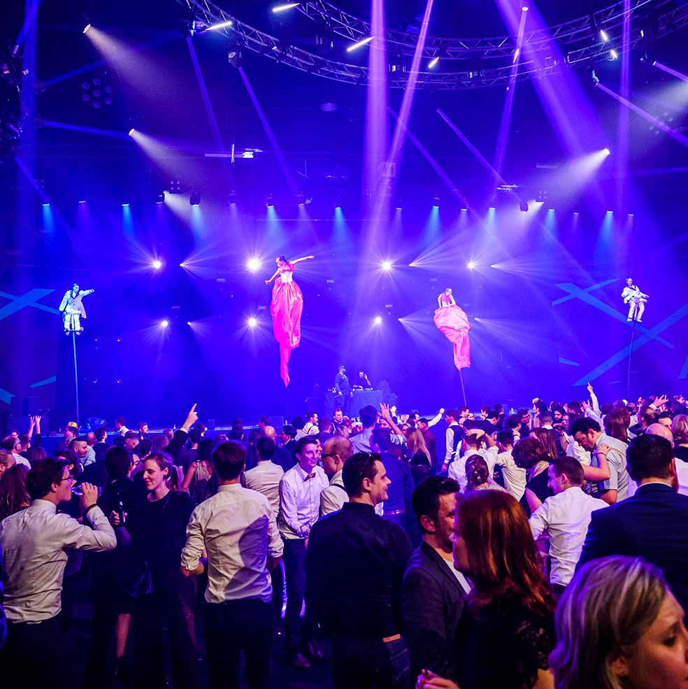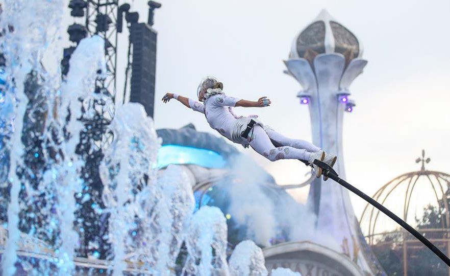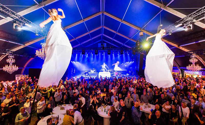 These theatrical aerialists offer elegant and acrobatic sway pole performances high above the audience.