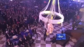 An awe-inspiring and stunning aerial performance by an exceptional aerialist suspended from a majestic crystal chandelier