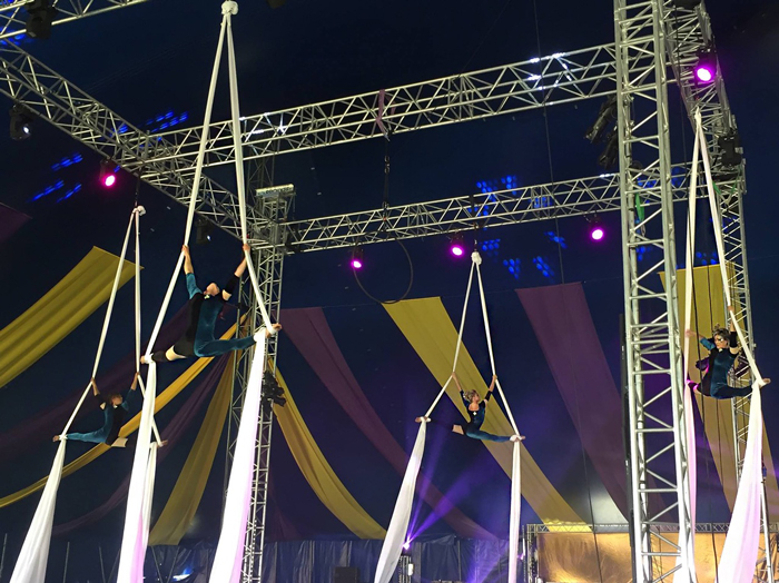 Performers can be booked with freestanding rigs for outdoor events or venues that lack rigging facilities.