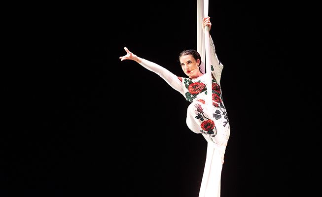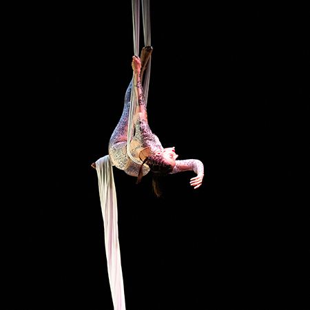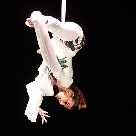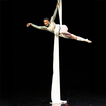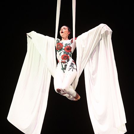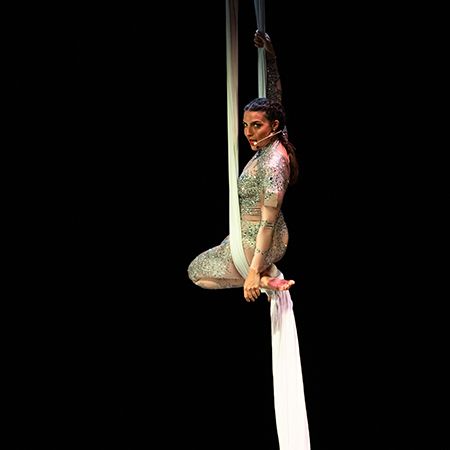 Performing indoors or outdoors worldwide, this aerial singer offers a premium package with an additional aerialist and 5–6 choreographed sequences