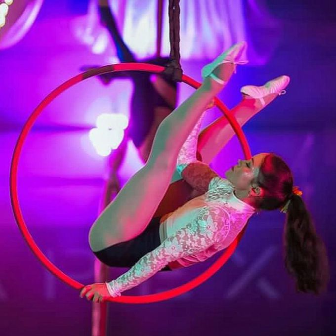 Our cirque aerialist showcases her remarkable grace, strength, and charisma in her captivating aerial dance routines on an aerial hoop.