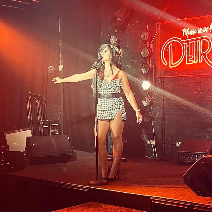 This performer embodies Amy Winehouse onstage, wearing accurate replica costumes and singing with a strong Cockney accent