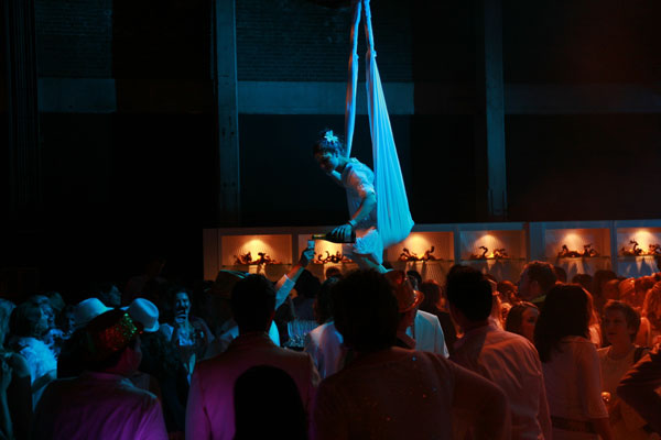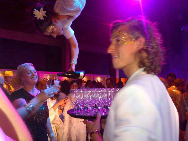 They can perform spectacular aerial acrobatics high above, serve champagne while suspended from luxurious pure white silks, and appear as a living installation floating effortlessly, offering a range of entertainment options to suit any event.