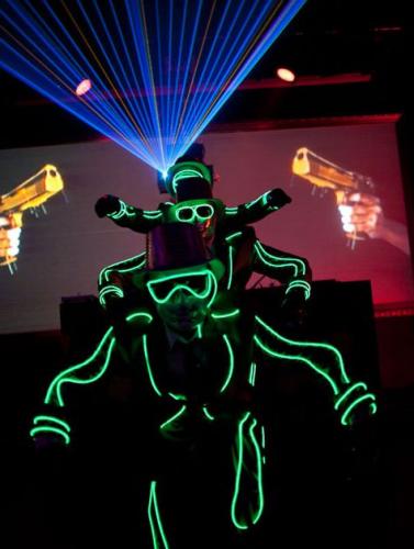 The production team can create custom props and costumes to meet your requirements, including LED company logos. They can even provide LED costumes for your VIPs.