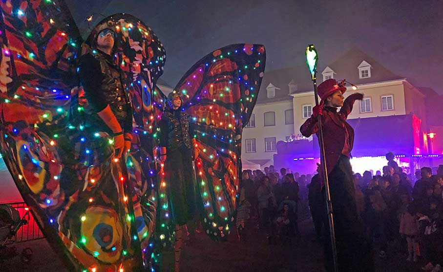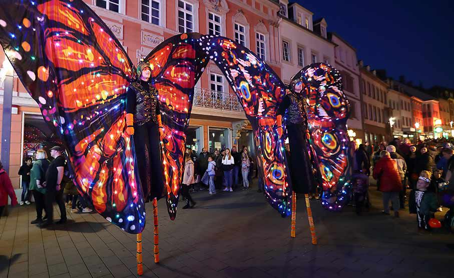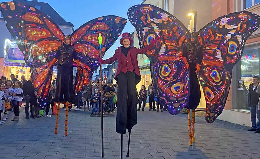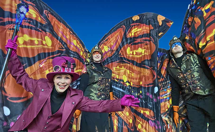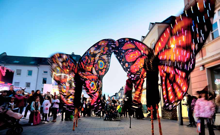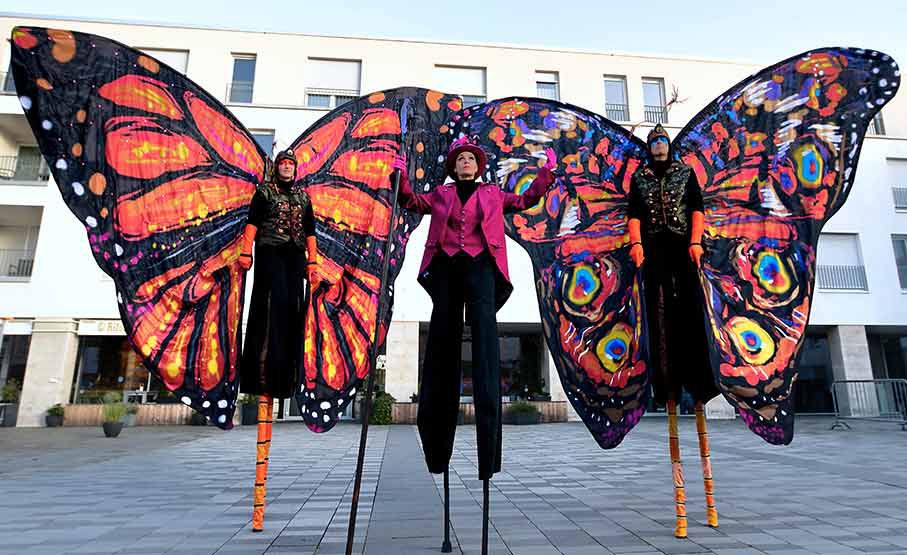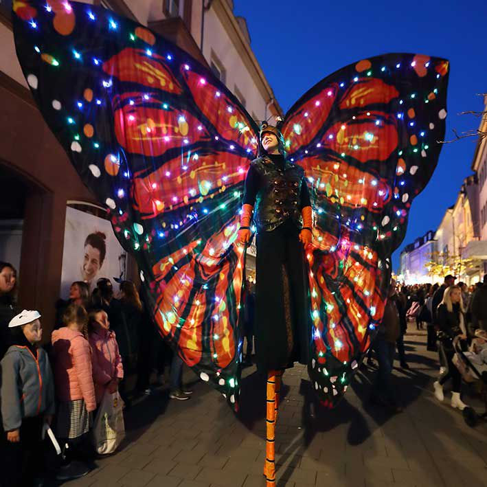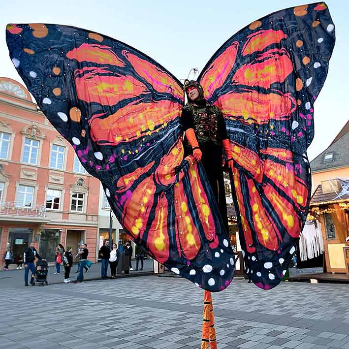 Our walkabout butterfly stilt walkers are based in Germany and available for parades, street festivals, and parties globally.