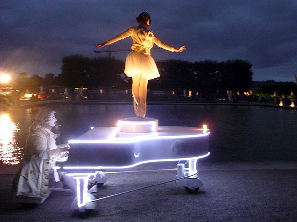 Gliding smoothly on motorized wheels, the enchanting piano act also illuminates with LEDs in the dark, captivating everyone who watches.