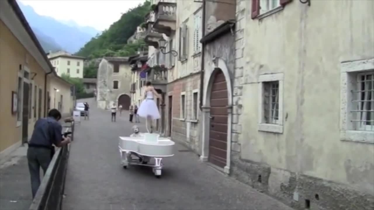 Showcasing a white grand piano operated by a mime from the eighteenth century, an otherworldly music box ballerina performs elegant dance moves and sways gently to the music.