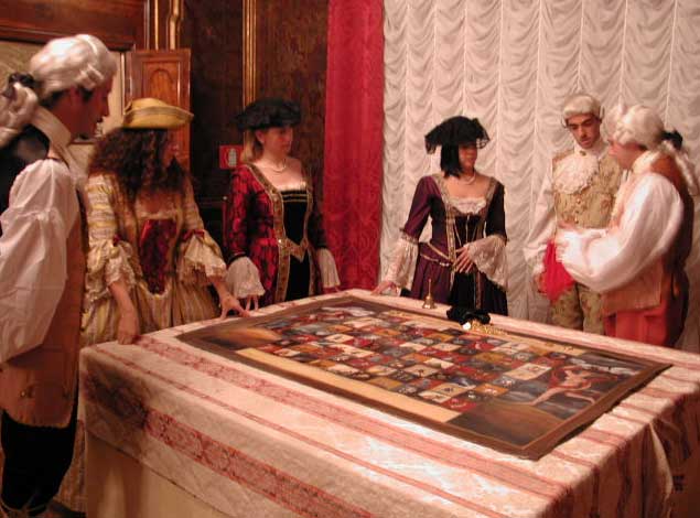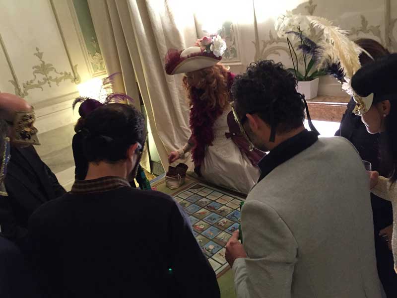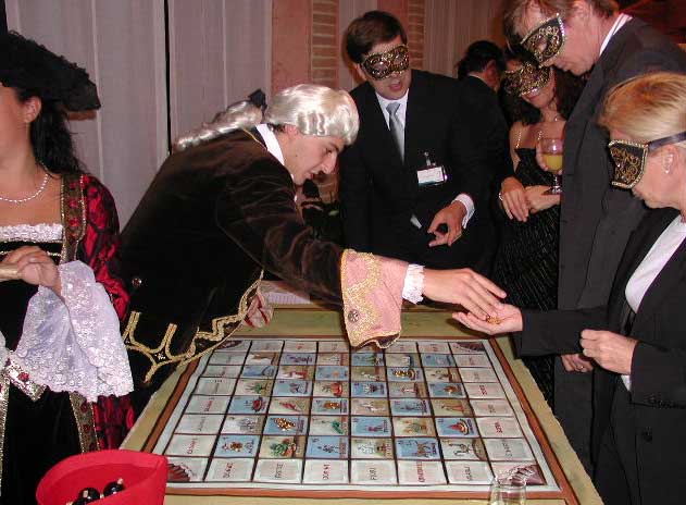 This simple but addictive game is perfect for a masquerade ball, and no authentic Venetian casino would be without it. A wooden table is decorated with paintings around a wheel with an arrow. Participants choose a painting to bet their money on and spin the arrow, hoping it lands on the drawing they placed their money on.