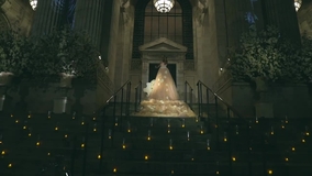 Positioned at the entrance of your event venue, our elegant violin hostess will present your guests with a scene of luxury in a flowing floral chiffon gown in a subtle pink color. Situated on a raised platform, the dress's uniquely long train (measuring 20ft!) will gracefully cascade down stairs or gently flow along walkways. For added effect, the dress can also be illuminated with external lighting, creating a breathtaking spectacle. Our Knot Gala violinist truly makes for the perfect dramatic entrance.