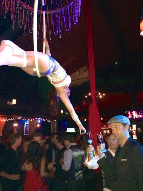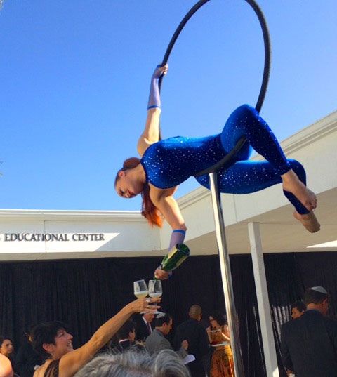 Bringing an extraordinary level of glamour, she creates the perfect first impression by serving chilled champagne while suspended from an aerial hoop or silks. Her impressive aerial performances include acts under hot air balloons and helium balloons, abseiling from helicopters into stadiums, and even a zip line stunt with Richard Branson to inaugurate a Virgin Mega Store in Los Angeles!