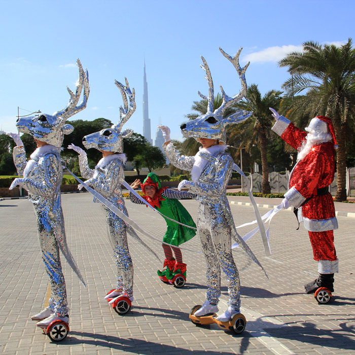 Book Christmas Characters Dubai to add glitzy, shiny fun to a wide range of events. The walkabout Santa and his entourage are particularly well-suited for shopping malls and promotional activities during the festive season. They can interact with visitors and distribute promotional material as they glide by on their hoverboards.