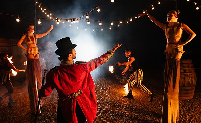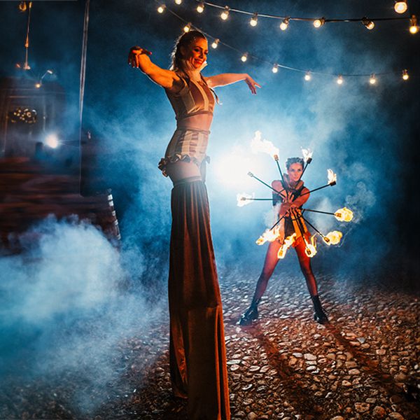 Available as a comprehensive circus-themed entertainment package, featuring stilt walkers along with fire performers, dancers, acrobats, and more