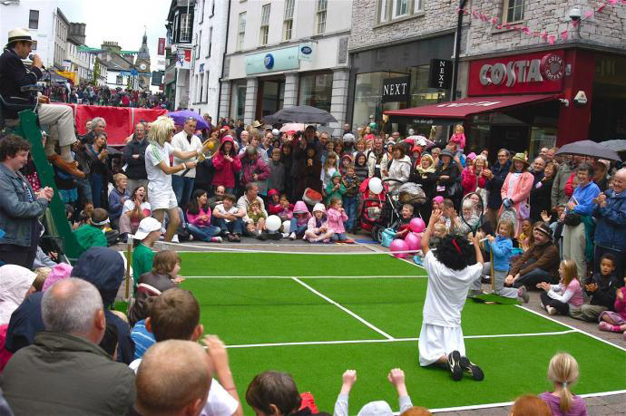Our street performers encourage plenty of audience participation, and brave spectators will fill the roles of ball boy, physiotherapist, and even royal award presenter in our fabulous tennis entertainment. This tennis act is great for outdoor festivals, street performances, and sporting events of all kinds, consistently drawing enormous crowds.