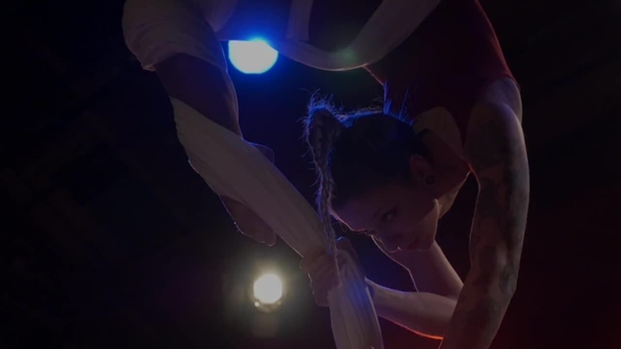 Their performances blend visual comedy with circus acts such as juggling, duo acrobatics, and aerial silks showcased on a freestanding rig.