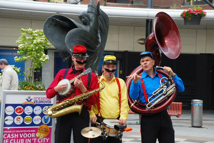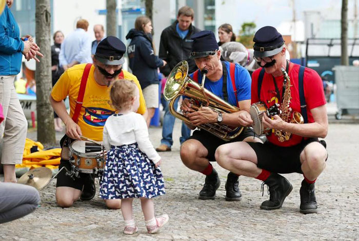 The Comedy Walkabout Musicians’ routines are vibrant, filled with fun, and highly audience-focused. They are constantly moving, engaging with the crowd, and creatively using their surroundings, including random objects as percussion instruments.