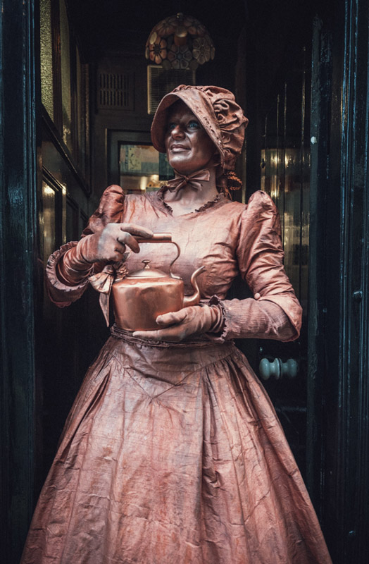 Treat your guests to a delightful and memorable vintage entertainment experience by booking our sensational living statue act, featuring a remarkable street performer who will transform into a charming copper tea lady. She will engage and entertain your guests with a variety of hilarious tactics. The perfect accent act for any social gathering, our exceptional human statue display will leave lasting impressions and unforgettable memories filled with humor, charm, and sophistication. This truly vintage street act will fill your event with energy, ensuring your guests stay entertained.