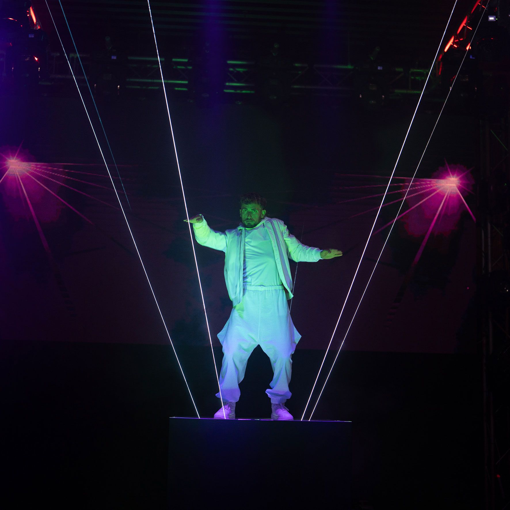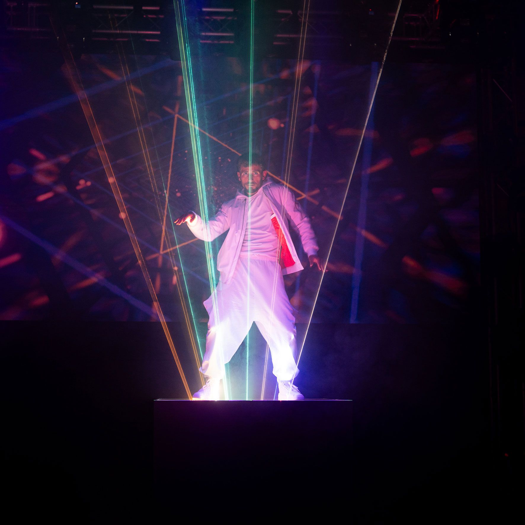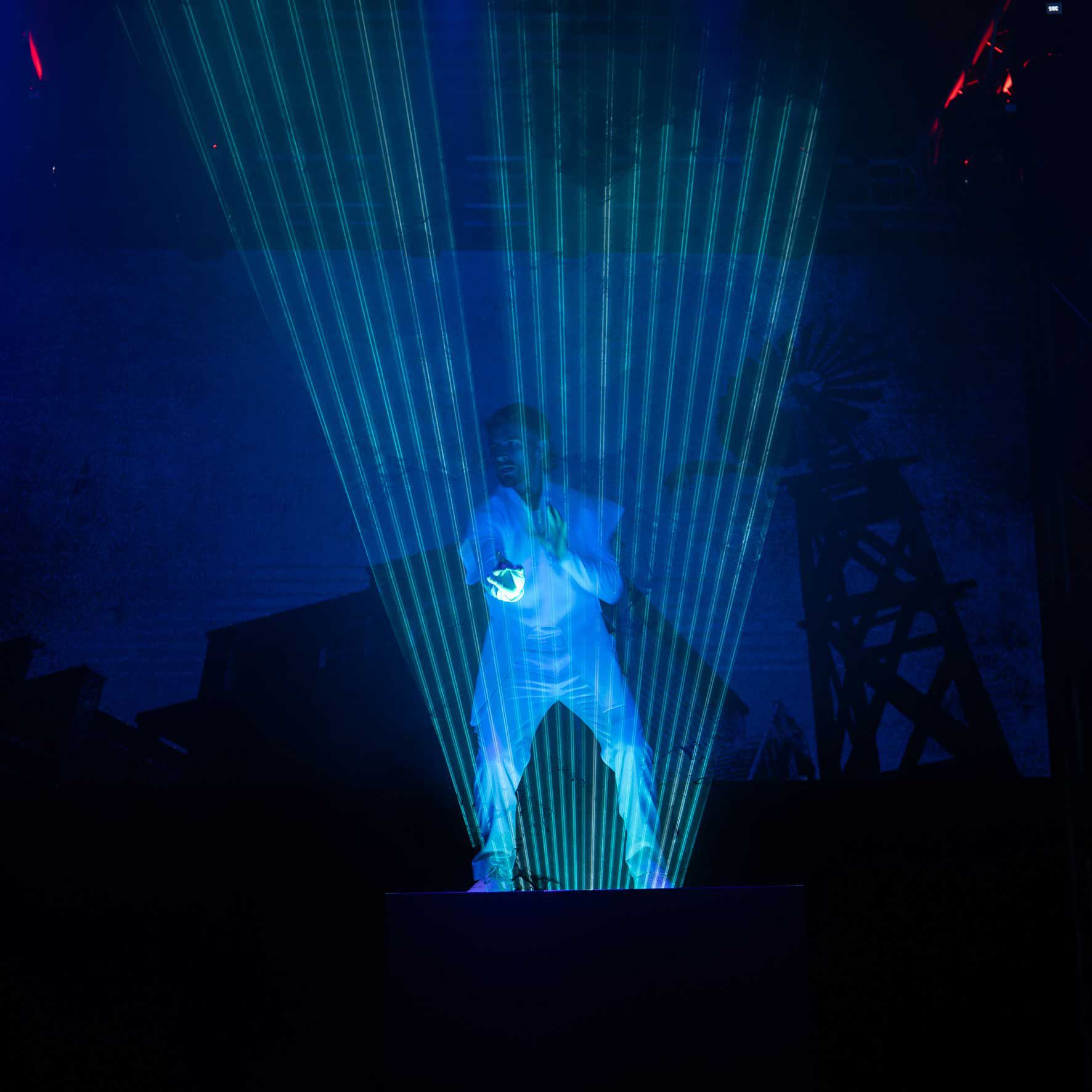 A dynamic solo dancer takes to the stage and manipulates laser beams as part of a dance performance to create a breathtaking visual spectacle