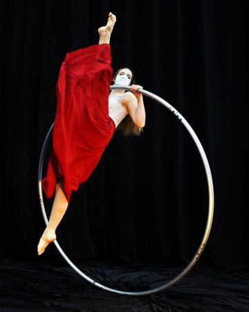 This acrobat is also skilled in aerial hoops, silks, and trapeze, making her a versatile entertainer capable of captivating audiences of any size.