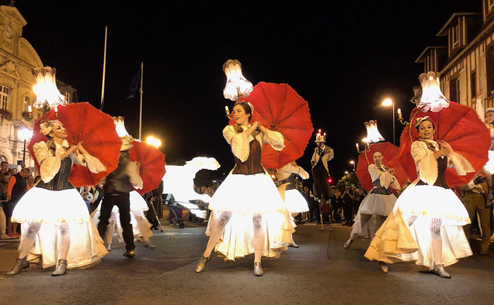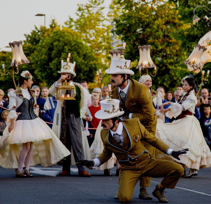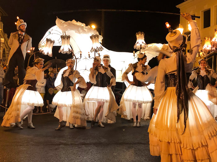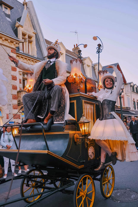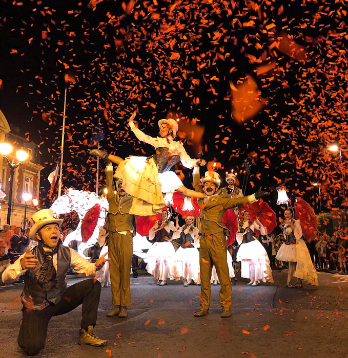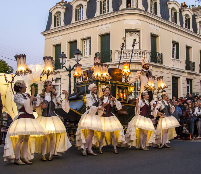 A breathtaking and whimsical street parade inspired by the Belle Époque, showcasing a continuously moving ball