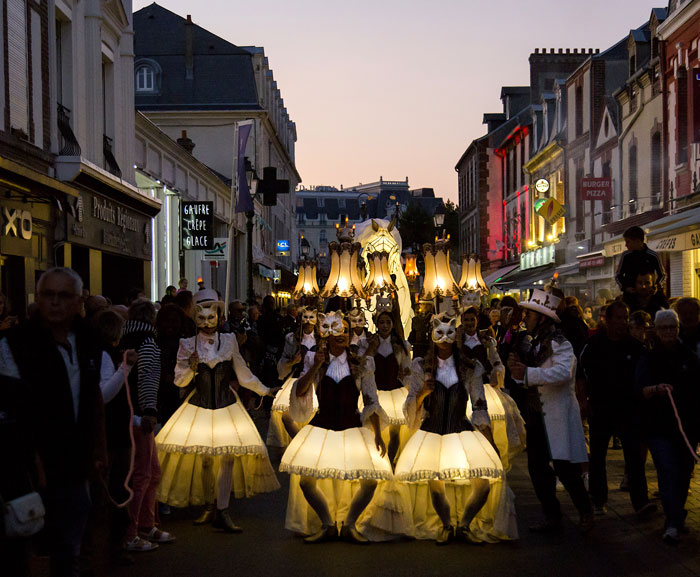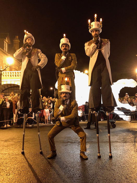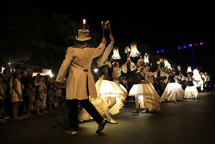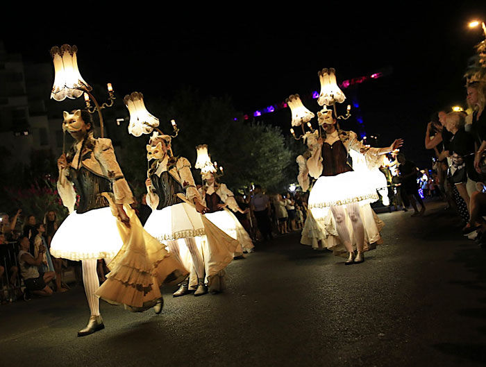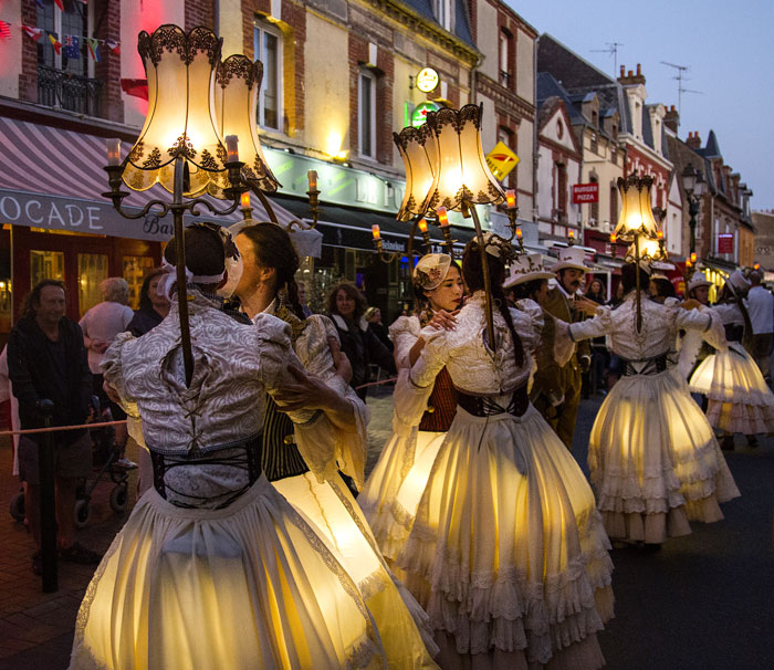 Features captivating stilt walkers, lamplighters, and lampshade dancers gracefully moving around two ethereal lovers